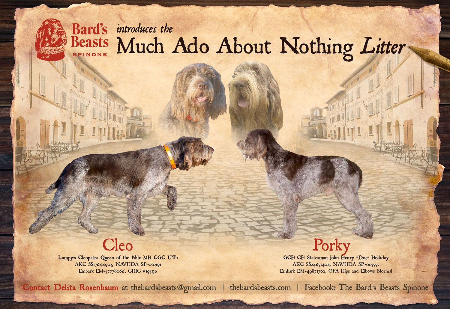 This breeding announcement was designed for a Spinone Italiano breeder. The litter theme was based on Shakespeare’s Much Ado About Nothing, so the design of the ad reflects that time period.